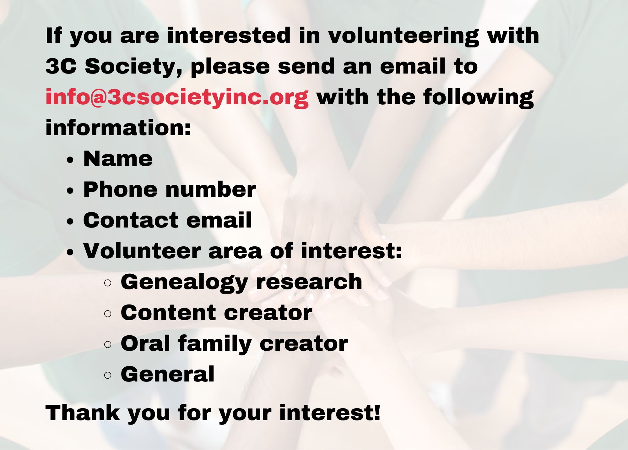 Email us at 3csocietyinc@gmail.com for more information.